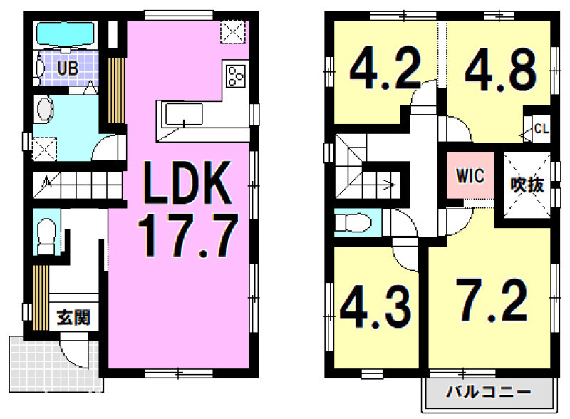 | 設備 | 上水道、下水道、室内洗濯機置場、IHクッキングヒーター、側溝、複層ガラス、モニタ付インターホン、システムキッチン、カウンターキッチン、食器洗浄乾燥機、浄水器、追焚機能、浴室乾燥機、トイレ2箇所、ディンプルキー、ウォッシュレット、Wローゼット | ||